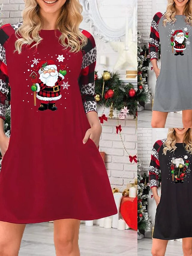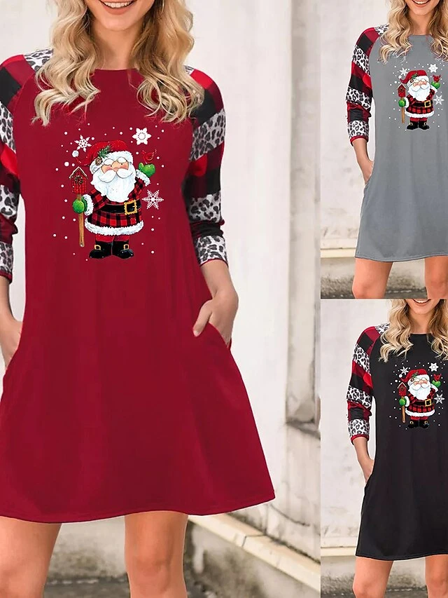 Women’s Christmas Casual Dress T Shirt Dress Tee DressShort Mini Dress Wine Grey Black Long Sleeve Santa Claus Snowflake Pocket Print Fall Winter Crew Neck Casual Modern 2022 S M L XL 2XL 3XL 4XL
