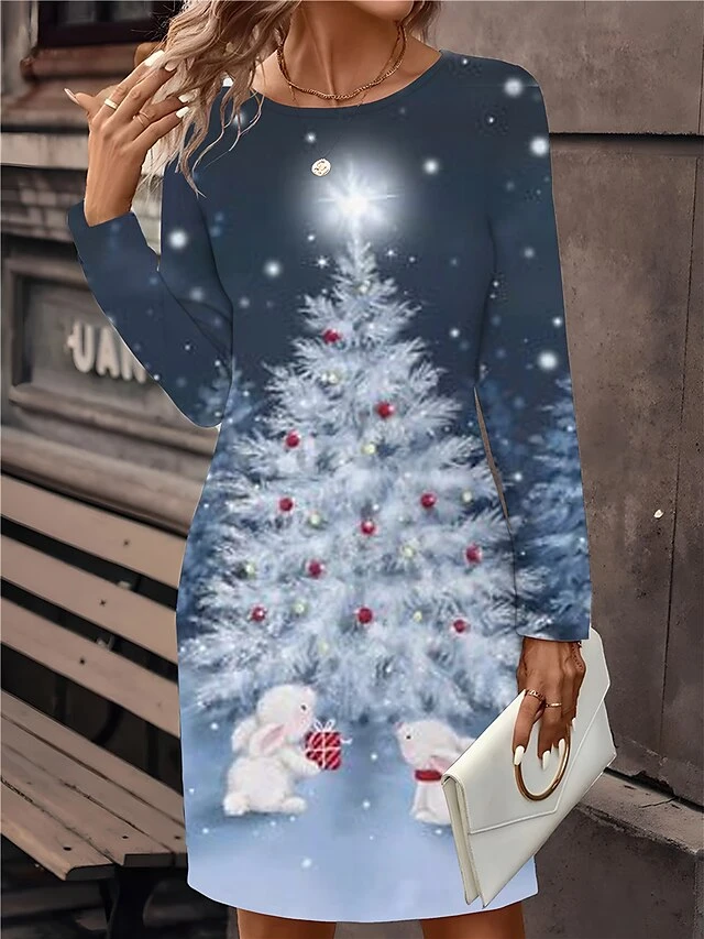 Women’s Christmas Dress Casual Dress Mini Dress Active Fashion Outdoor Christmas Holiday Crew Neck Print Christmas Tree Snowflake Deer Loose Fit White Wine Red S M L XL XXL