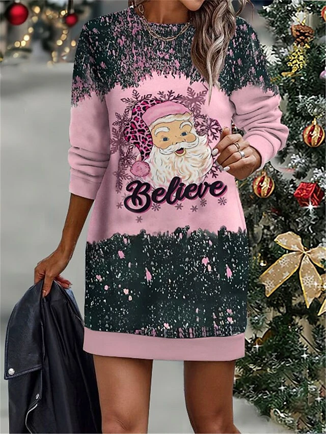 Women’s Christmas Dress Casual Dress Mini Dress Warm Fashion Outdoor Christmas Vacation Crew Neck Print Santa Claus Regular Fit Pink Khaki Gray S M L XL XXL