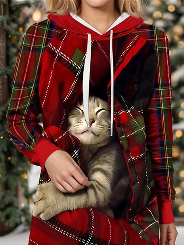 Women’s Christmas Dress Hoodie Dress Mini Dress Warm Fashion Outdoor Christmas Holiday Hoodie Print Geometric Cat Loose Fit Wine S M L XL XXL