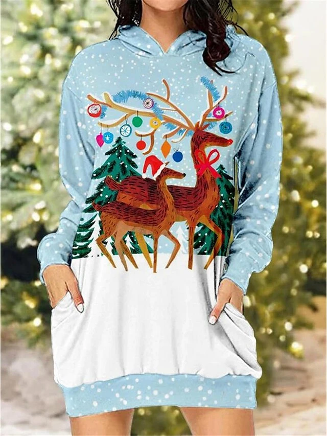 Women’s Christmas Dress Hoodie Dress Mini Dress Warm Fashion Outdoor Christmas Vacation Hoodie Pocket Print Snowman Christmas Bell Regular Fit Wine Red Blue S M L XL XXL