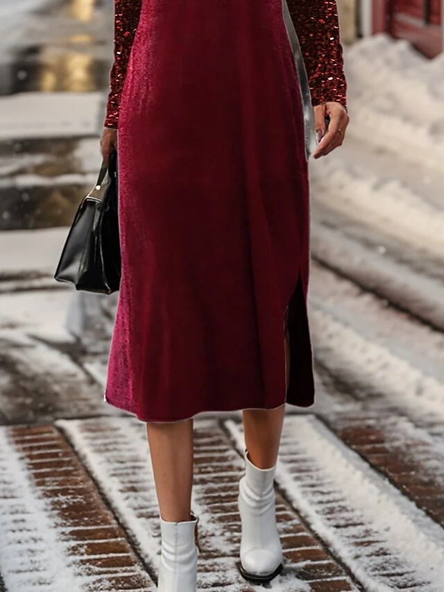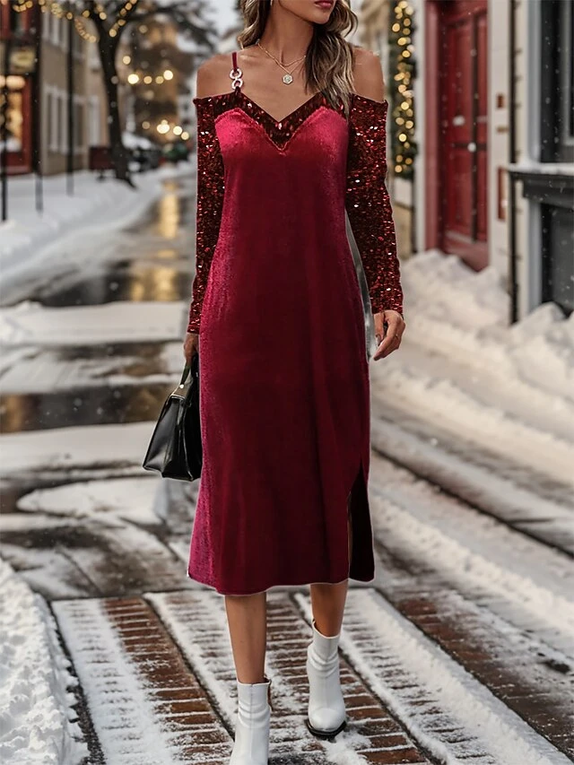 Women’s Christmas Dress Velvet Dress Casual Dress Midi Dress Sequins Patchwork Outdoor Christmas Daily Fashion Streetwear Strap Long Sleeve 2023 Regular Fit Wine Color S M L XL XXL Size