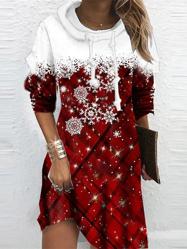 Women’s Christmas Hoodie Dress Shift Dress Mini Dress Green Blue Wine Long Sleeve Plaid Snowflake Print Winter Fall Hooded Vacation Casual 2022 S M L XL XXL 3XL
