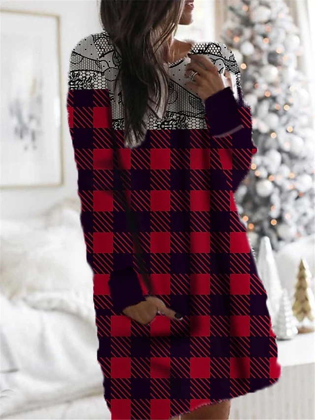 Women’s Christmas Hoodie Dress Shift Dress Mini Dress Wine Light Red Fuchsia Red White Long Sleeve Plaid Elk Color Gradient Pocket Print Winter Fall Hooded Casual 2022 S M L XL XXL 3XL