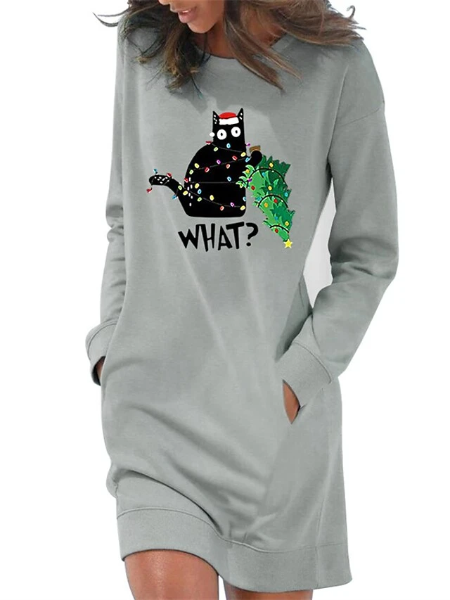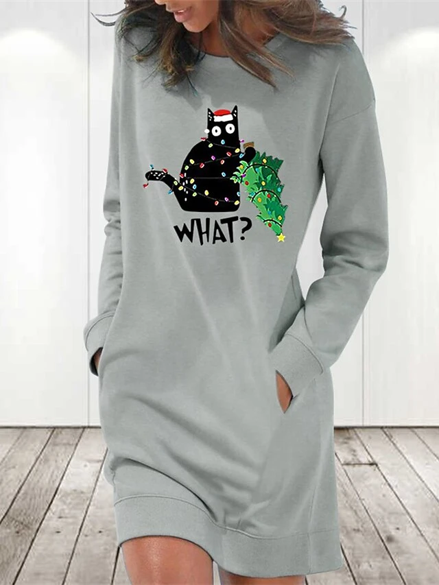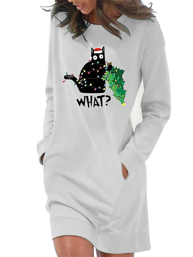 Women‘s Christmas Hoodie Dress Winter Dress Light Blue Grey White Long Sleeve Cat Tree Pocket Print Winter Fall Crew Neck Stylish Casual Fall Dress Loose Fit 2022 S M L XL 2XL / Cotton
