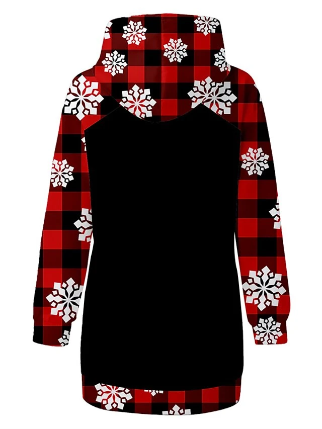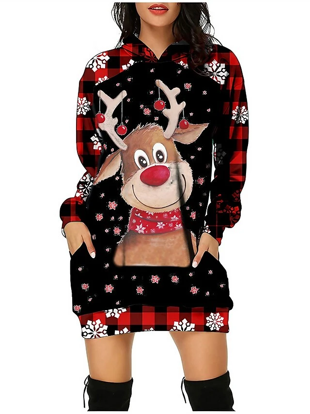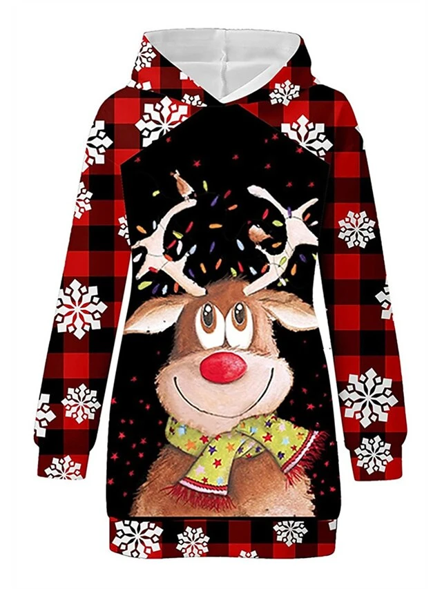 Women‘s Christmas Hoodie Dress Winter Dress Snowflake Scarf Fawn Star Scarf Fawn Cape Deer Colored Horned Fawn Long Sleeve Elk Snowflake Pocket Print Winter Fall Hooded Stylish Casual Fall Dress