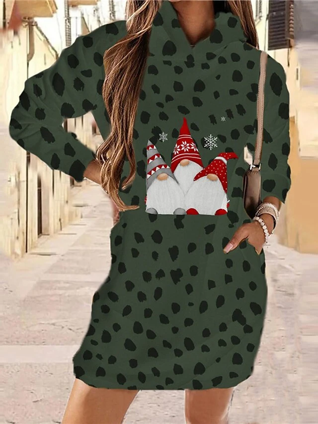Women‘s Christmas Hoodie Dress Winter DressShort Mini Dress Green Khaki Gray Long Sleeve Leopard Santa Claus Pocket Print Fall Winter Hooded Vacation Casual 2022 S M L XL XXL 3XL