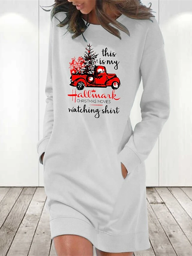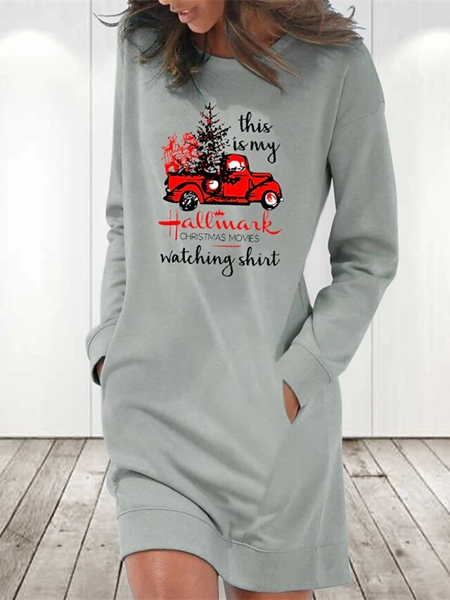 Women‘s Christmas Hoodie Dress Winter DressShort Mini Dress Light Blue Grey White Long Sleeve Letter Print Pocket Print Fall Winter Crew Neck Stylish Casual 2022 S M L XL 2XL / Cotton