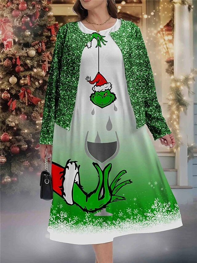 Women’s Christmas Plus Size Curve Casual Dress Dress Set Two Piece Dress Gradient Snowflake Midi Dress Long Sleeve Print Crew Neck Fashion Outdoor Green Fall Winter L XL XXL 3XL 4XL