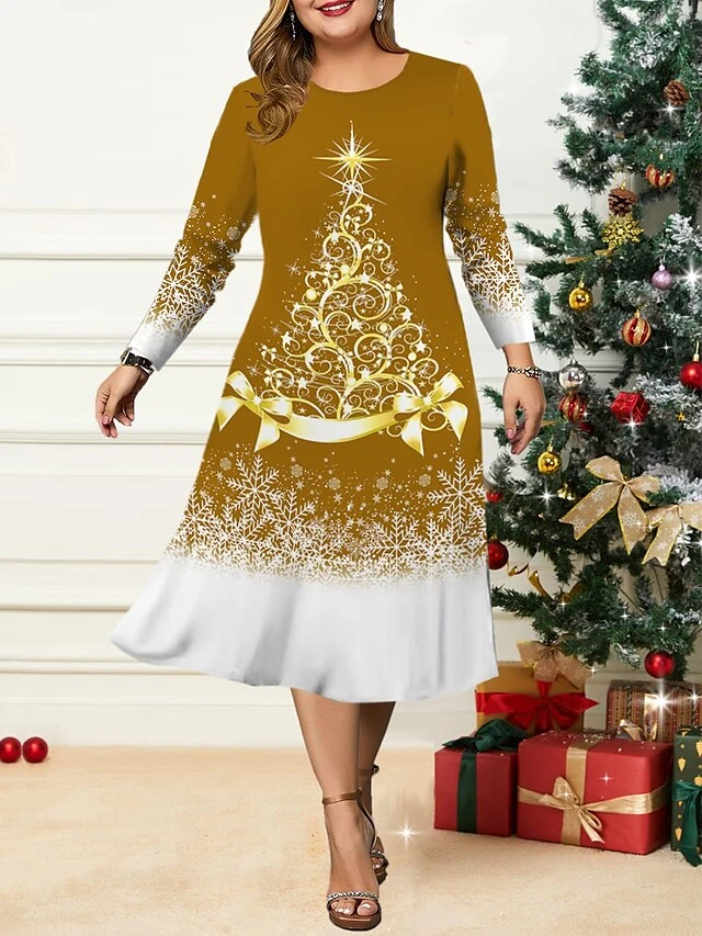 Women’s Christmas Plus Size Curve Casual Dress Skater Dress A Line Dress Christmas Tree Snowflake Midi Dress Long Sleeve Print Crew Neck Fashion Outdoor Yellow Wine Fall Winter L XL XXL 3XL 4XL