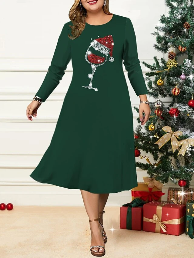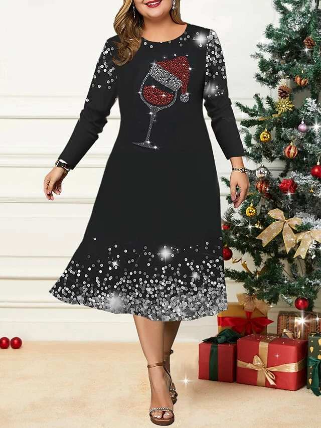 Women’s Christmas Plus Size Curve Casual Dress Skater Dress A Line Dress Graphic Snowflake Midi Dress Long Sleeve Print Crew Neck Fashion Outdoor Black Wine Fall Winter L XL XXL 3XL 4XL