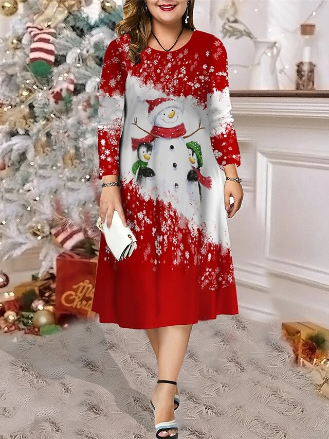Women’s Christmas Plus Size Curve Casual Dress Skater Dress A Line Dress Santa Claus Snowman Midi Dress Long Sleeve Print Crew Neck Fashion Outdoor Black Wine Fall Winter L XL XXL 3XL 4XL
