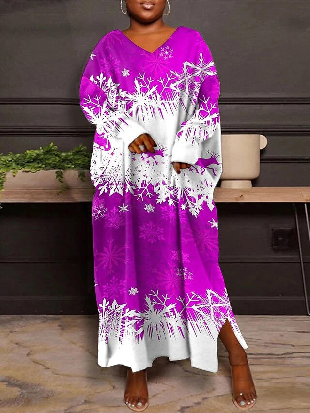 Women’s Christmas Plus Size Curve Casual Dress Winter Dress Snowflake Long Dress Maxi Dress Long Sleeve Print V Neck Fashion Outdoor Red Blue Fall Winter L XL XXL 3XL 4XL