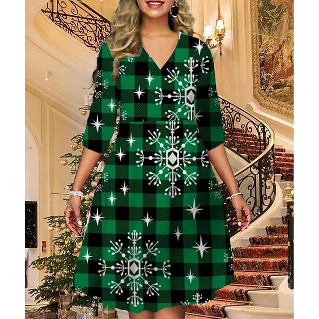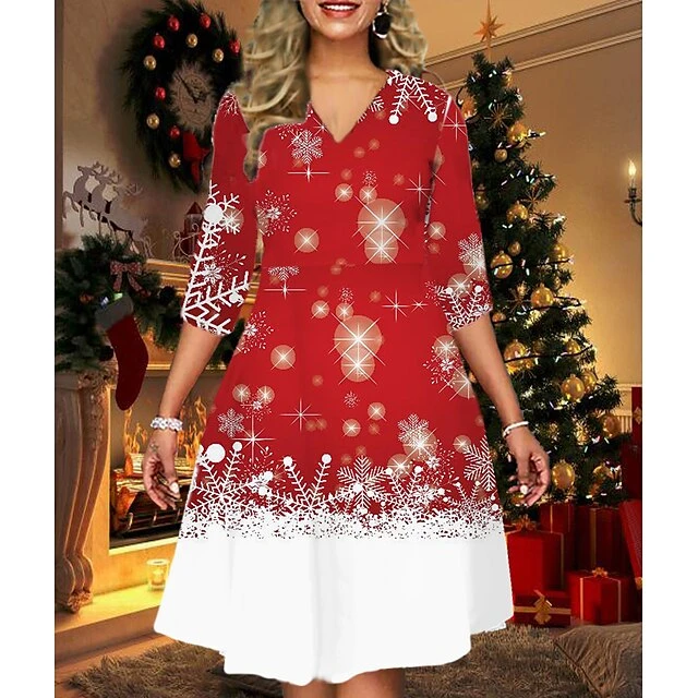 Women’s Christmas Print Dress Wine Light Red Dark Green Red Black Long Sleeve Elk SnowmanTree Print Winter Autumn V Neck Fashion CasualFall Dress Loose Fit 2022 S M L XL 2XL 3XL 4XL 5XL