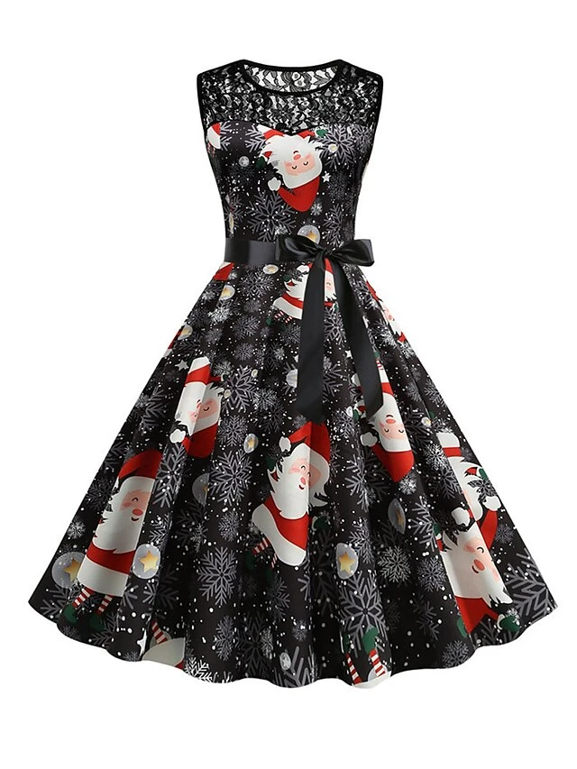 Women‘s Christmas Retro 1950s Vintage Dress Midi Dress Party Patchwork Bow Santa Claus Crew Neck Sleeveless Regular Fit Fall Winter 2023 Black White S M L XL
