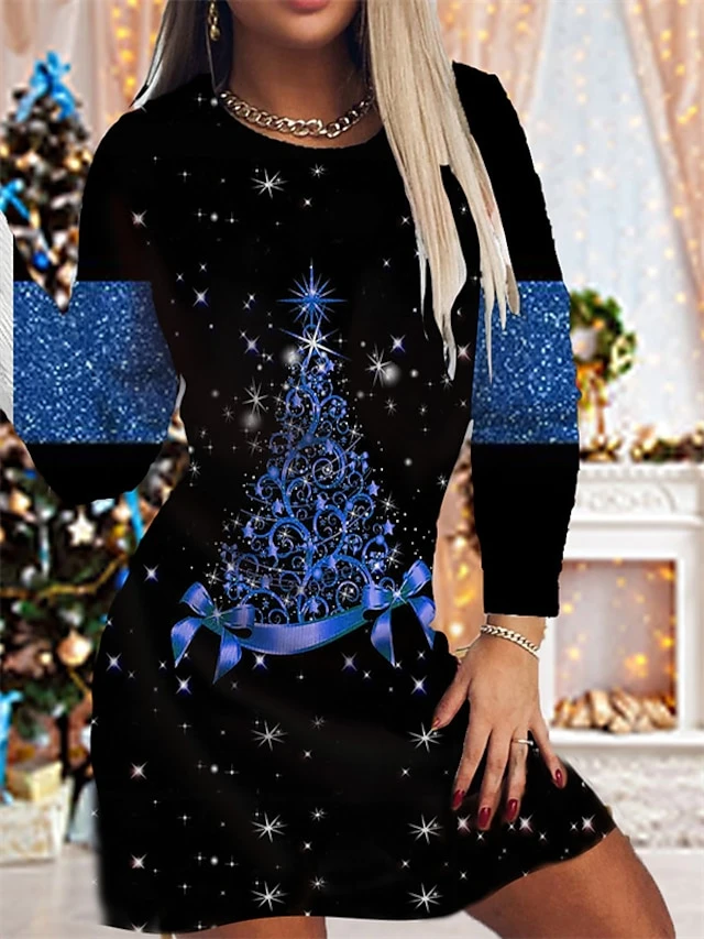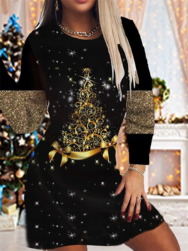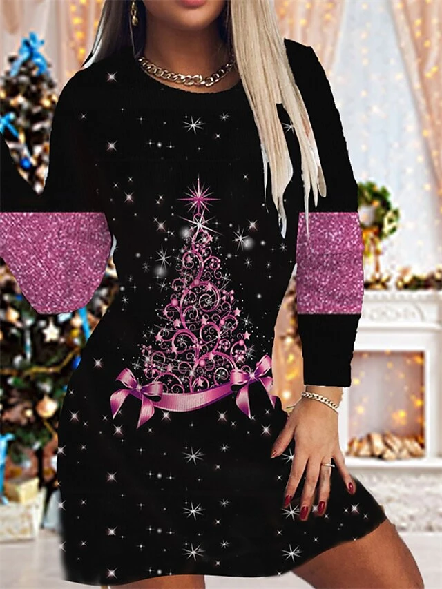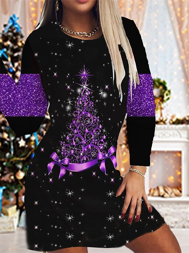Women’s Christmas Sheath Dress Print Dress Mini Dress Green Blue Purple Pink Gold Long Sleeve Print Print Winter Fall Crew Neck Fashion Modern 2022 S M L XL 2XL 3XL 4XL 5XL 6XL