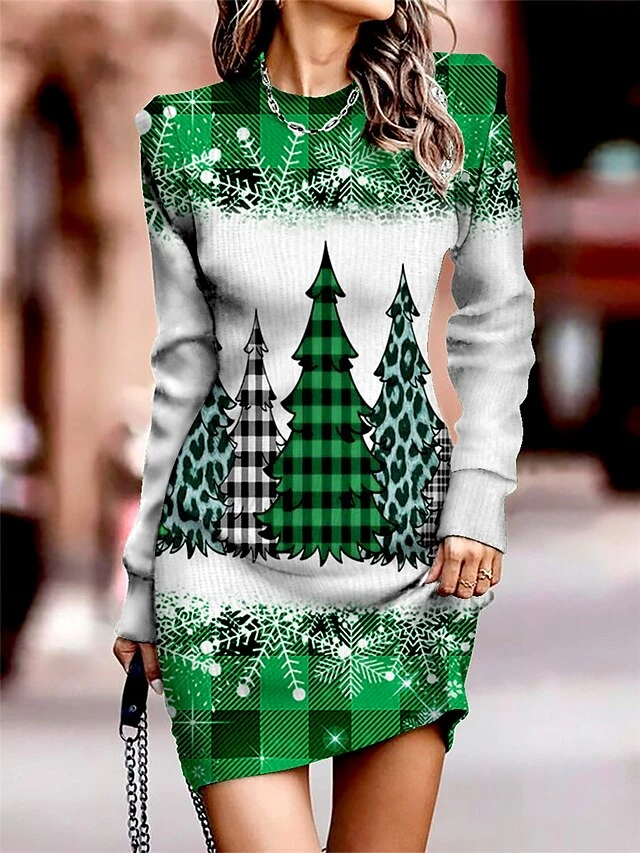 Women‘s Christmas Sweater Dress Jumper Dress Winter Dress Warm Christmas Tree Snowflake Outdoor Christmas Daily Holiday Crew Neck Long Sleeve 2023 Regular Fit Wine Blue Green S M L XL