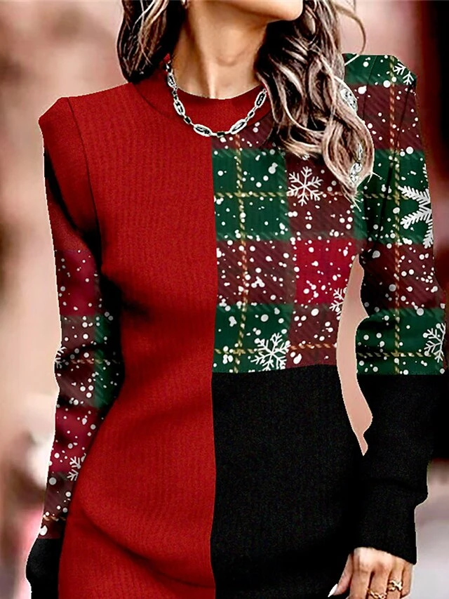 Women‘s Christmas Sweater Dress Jumper Dress Winter Dress Warm Geometric Color Block Outdoor Christmas Daily Holiday Crew Neck Long Sleeve 2023 Regular Fit Wine S M L XL XXL 3XL