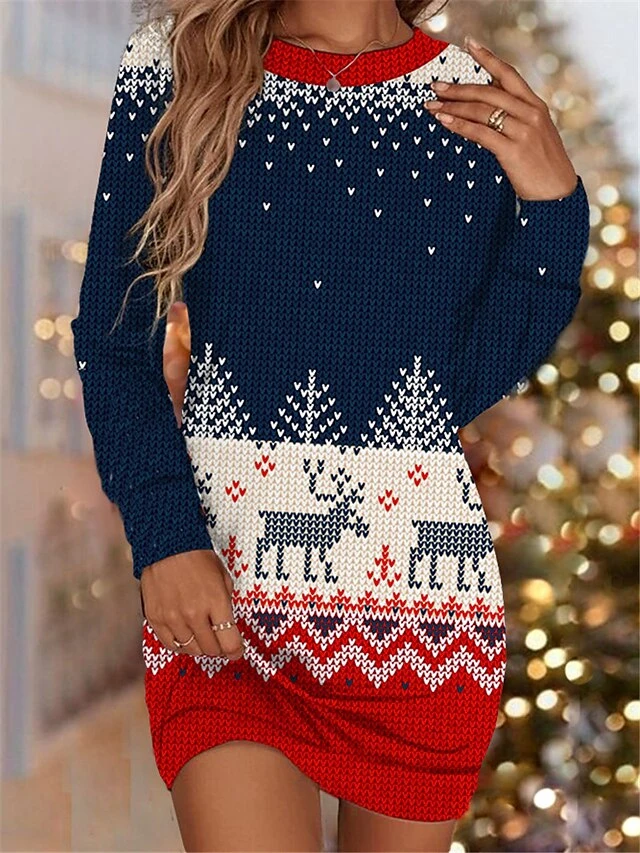Women’s Christmas Sweatshirt Dress Shift Dress Blue Navy Blue Long Sleeve Elk Print Winter Fall Autumn Fashion Christmas Daily Loose Fit 2022 S M L XL XXL 3XL
