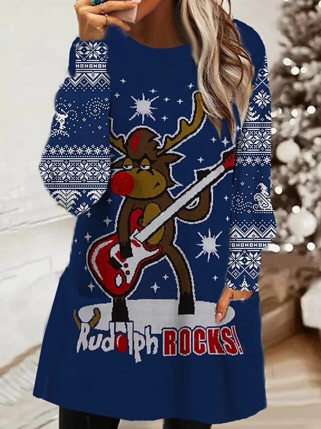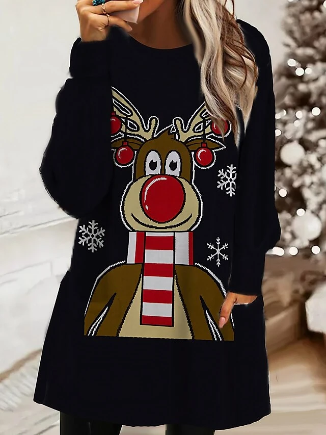 Women‘s Christmas Sweatshirt Dress Shift Dress Mini Dress Black Blue Navy Blue Long Sleeve Elk Pocket Winter Fall Autumn Crew Neck Daily Loose Fit 2022 S M L XL XXL 3XL
