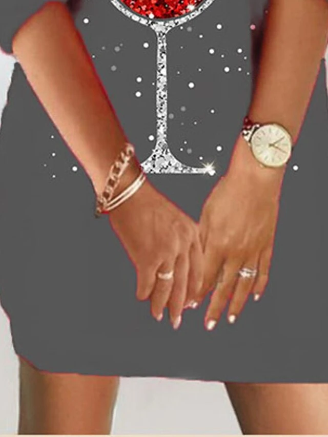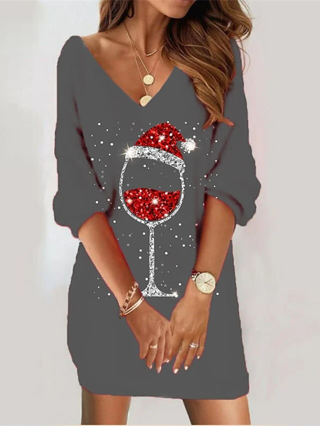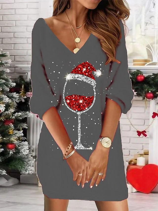 Women’s Christmas Sweatshirt Dress Shift Dress Mini Dress Gray 3/4 Length Sleeve Hat Print Winter Fall V Neck Vacation Casual 2022 S M L XL XXL 3XL