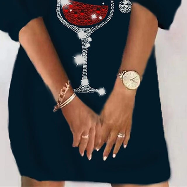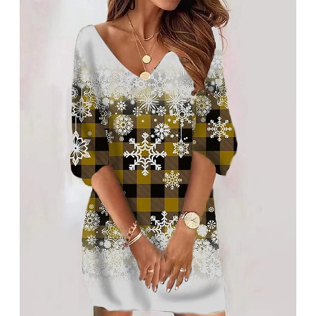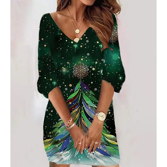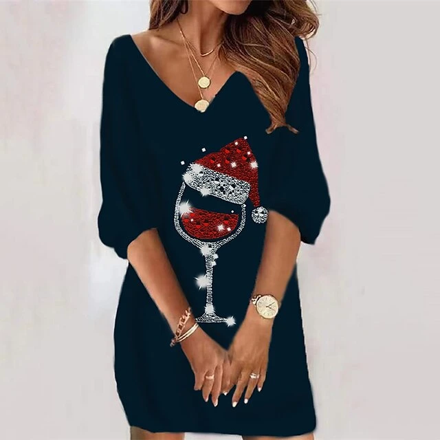 Women‘s Christmas Sweatshirt Dress Winter Dress Short Mini Dress Black 3/4 Length Sleeve Hat Print Fall Winter V Neck Vacation Casual 2022 S M L XL XXL 3XL