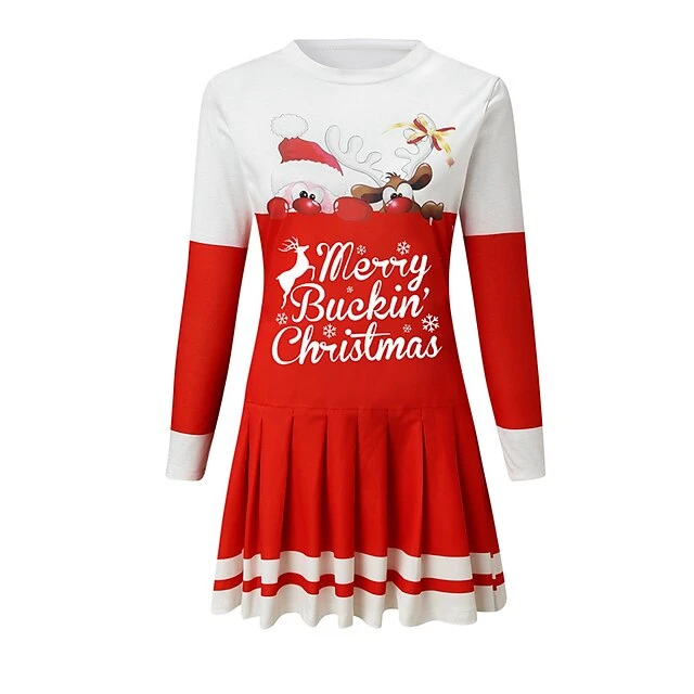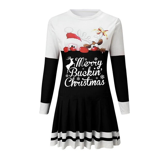 Women’s Christmas Swing Dress Blue Red Black Long Sleeve Letter Santa Claus Elk Pleated Print Winter Fall Crew Neck Stylish Romantic Fall Dress Loose Fit 2022 S M L XL XXL / Winter Dress