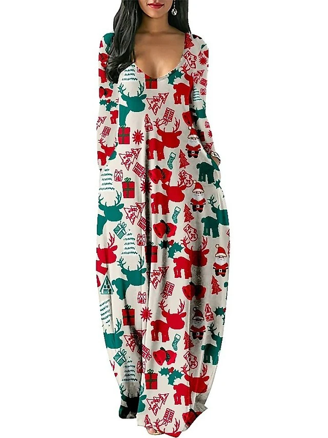 Women’s Christmas Swing Dress Green Wine Light Red Long Sleeve Snowman Print Winter Fall Autumn Deep U Modern Weekend 2022 S M L XL 2XL 3XL