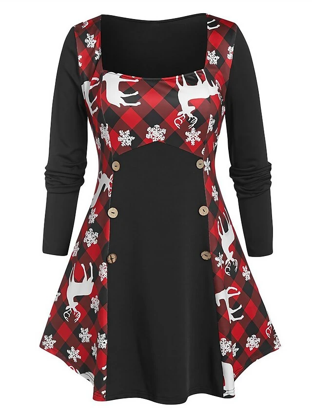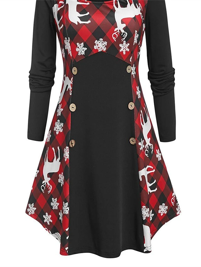 Women’s Christmas Swing Dress Print Dress Mini Dress Black Long Sleeve Print Button Print Winter Fall Square Neck Fashion Casual RomanticFall Dress 2022 S M L XL 2XL / Winter Dress
