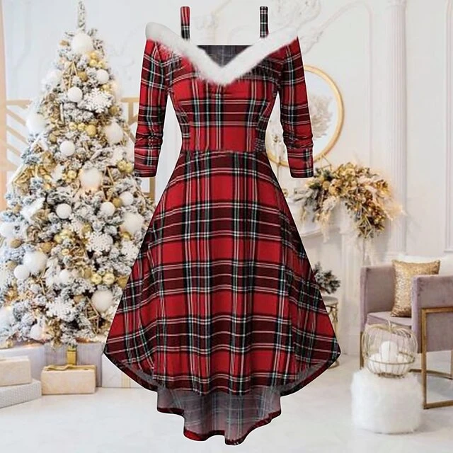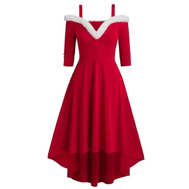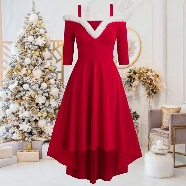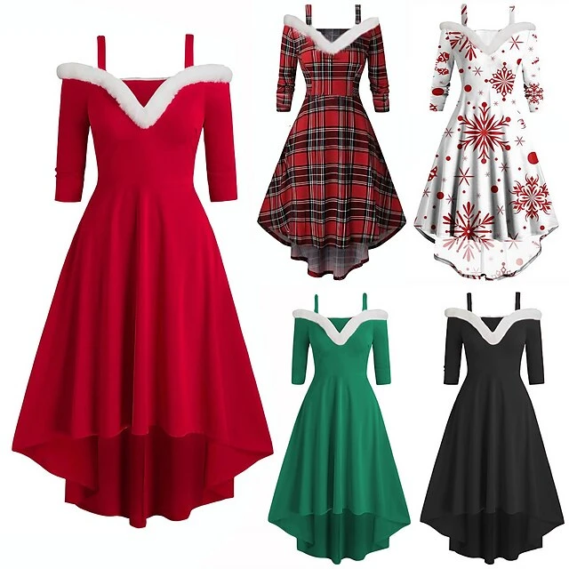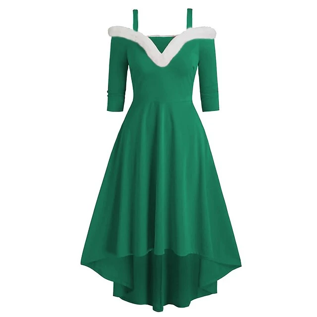 Women’s Christmas Swing Dress Skater Dress Green Red Black Long Sleeve Pure Color Cold Shoulder Plus High Low Winter Fall V Neck Classic ModernFall Dress Slim 2022 S M L XL 2XL 3XL / Winter Dress