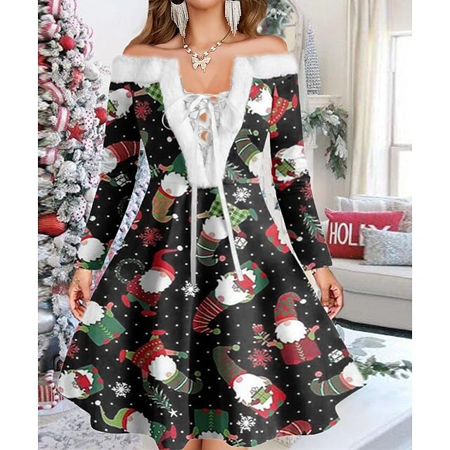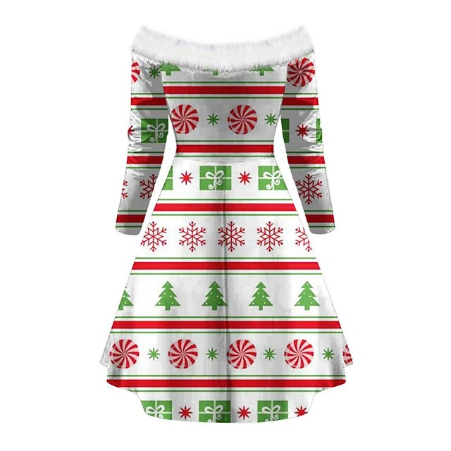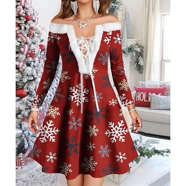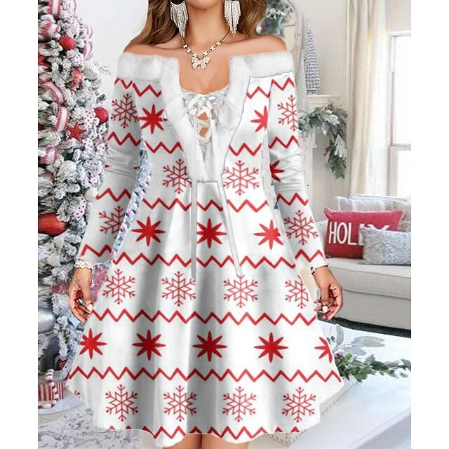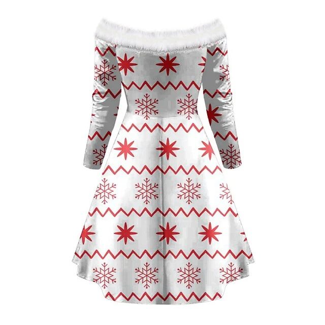 Women’s Christmas Swing Dress Vintage Dress Mini Dress Green Light Green Wine Red Navy Blue White Long Sleeve Snowman Tree Snowflake Backless Feather Print Winter Fall Off Shoulder Vacation Stylish