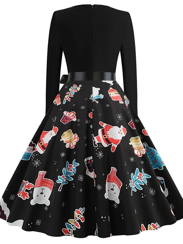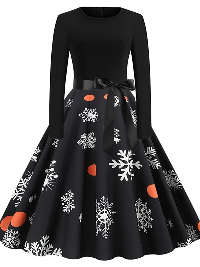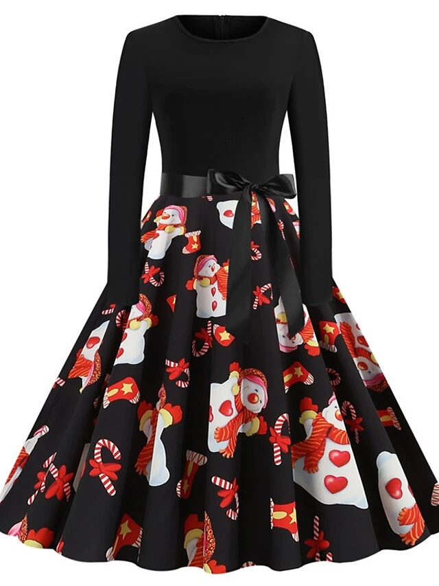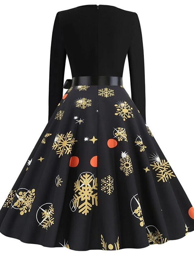 Women’s Christmas Swing DressKnee Length Dress Black And White White Light Red Gold Red Long Sleeve Elk Snowman Bell Bow Print Fall Winter Round Neck Vintage Elegant 2022 S M L XL 2XL