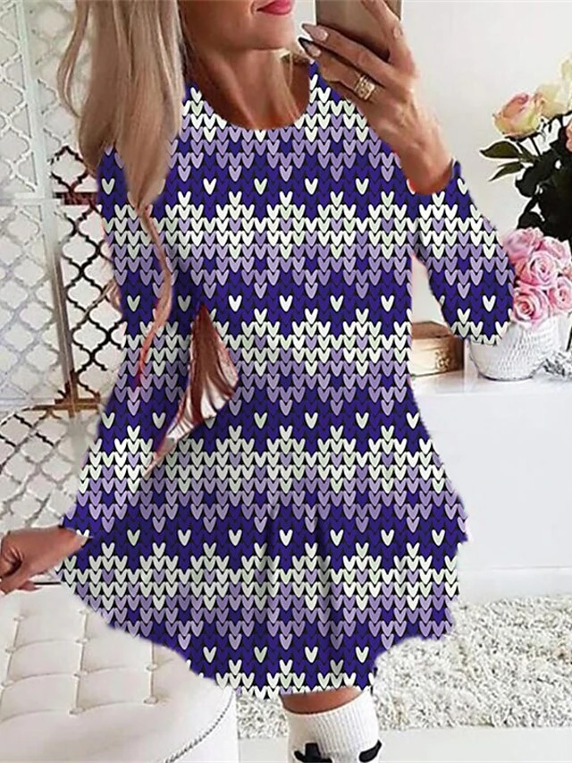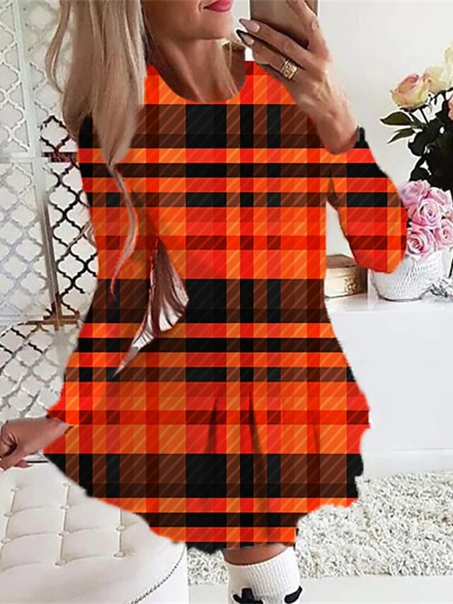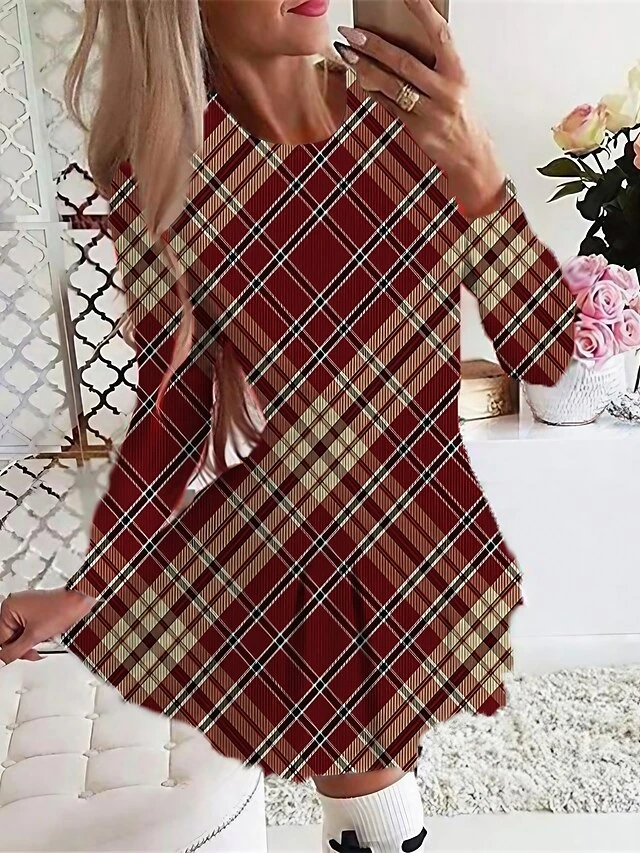 Women’s Christmas Swing DressShort Mini DressShort Mini Dress Light Yellow Purple Dark Blue Orange Red Long Sleeve Plaid Snowman Tree Pleated Print Fall Winter Crew Neck Stylish Romantic