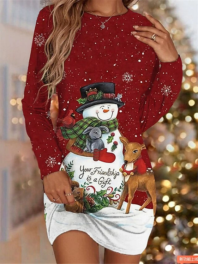 Women’s Christmas T Shirt Dress Tee Dress Bodycon Mini Dress Wine Black Long Sleeve Letter Santa Claus Snowman Print Winter Fall Crew Neck Vacation Casual 2022 S M L XL XXL 3XL 4XL 5XL 6XL
