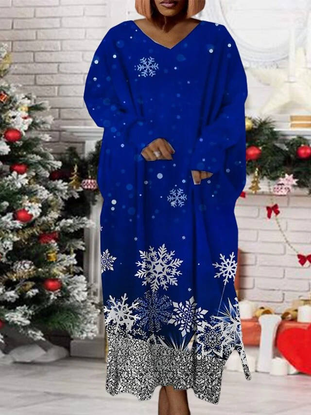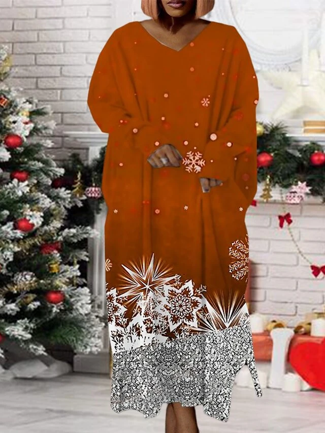 Women‘s Plus Size Christmas Dress Print V Neck Long Sleeve Winter Fall Modern Maxi Long Dress Daily Dress