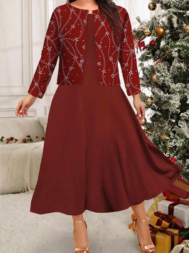 Women’s Plus Size Curve Casual Dress Winter Dress Dress Set Floral Mini Dress Long Sleeve Crew Neck Fashion Christmas Wine Fall Winter L XL XXL 3XL 4XL