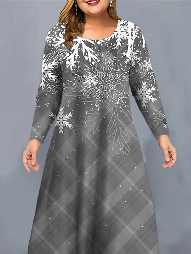 Women’s Plus Size Curve Christmas Dress Casual Dress Skater Dress Plaid Snowflake Midi Dress Long Sleeve Print Crew Neck Fashion Outdoor Wine Gray Fall Winter L XL XXL 3XL 4XL