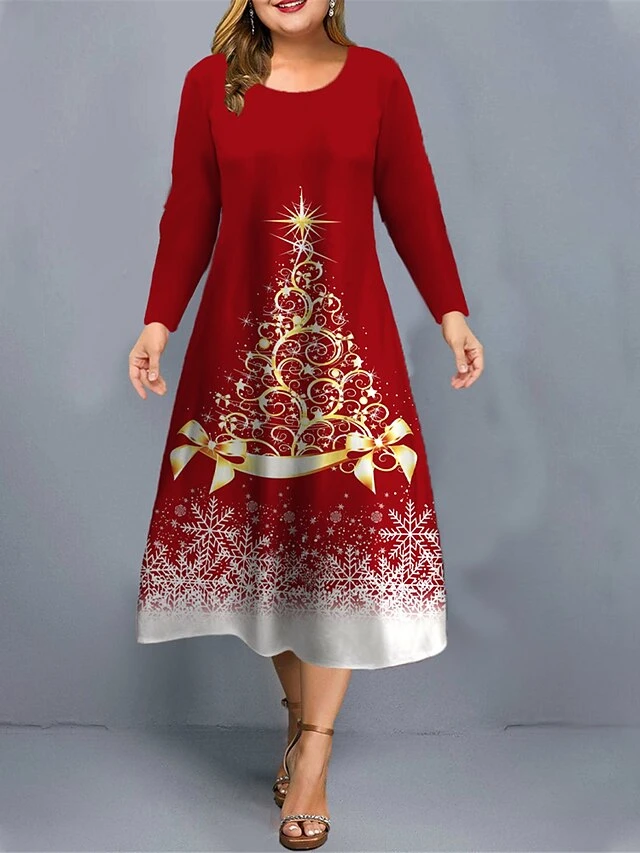 Women’s Plus Size Curve Christmas Dress Casual Dress Skater Dress Snowman Christmas Tree Midi Dress Long Sleeve Print Crew Neck Fashion Outdoor Black Wine Fall Winter L XL XXL 3XL 4XL
