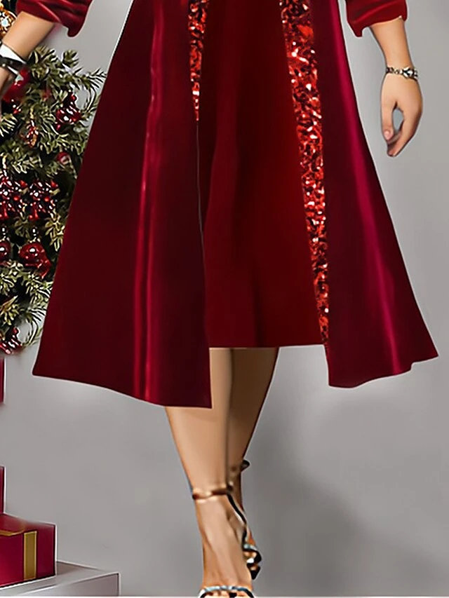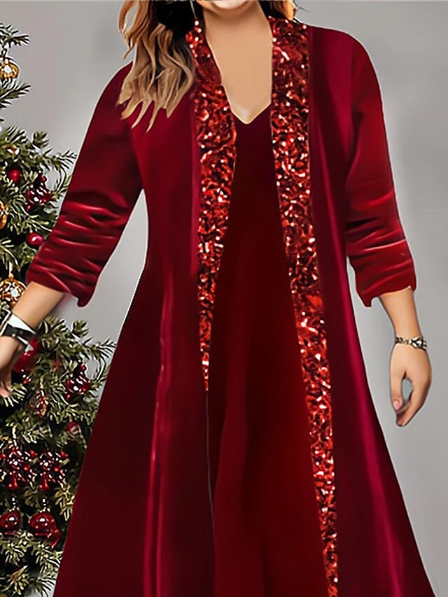 Women’s Plus Size Two Piece Dress Set Velvet Dress Party Dress Party Christmas Fashion Elegant Patchwork Sequin Midi Dress V Neck 3/4 Length Sleeve Plain Regular Fit Wine Fall Winter L XL XXL 3XL 4XL