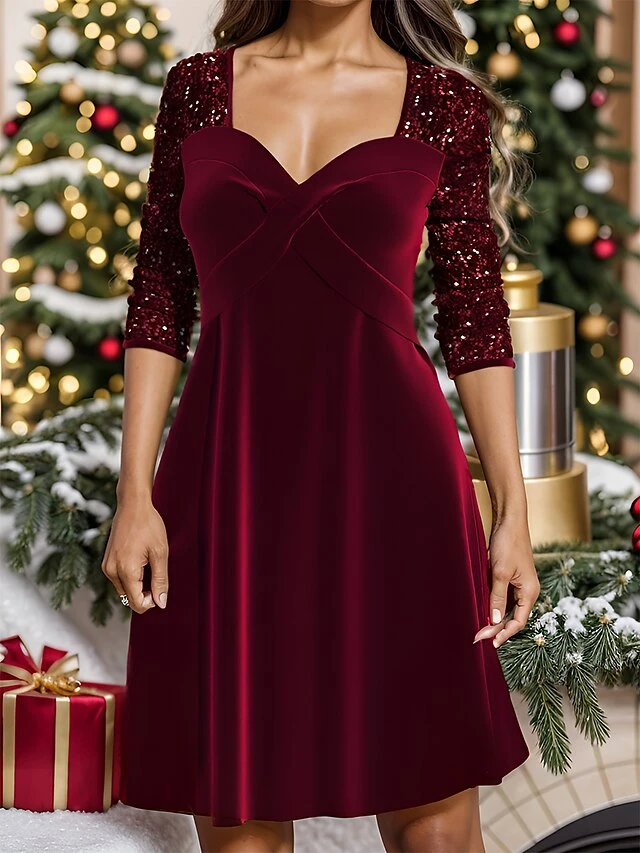 Women’s Velvet Dress Casual Dress Sequin Dress Mini Dress Wine Gold Green Long Sleeve Pure Color Sequins Fall Winter Autumn V Neck Fashion Winter Dress Christmas Wedding Guest S M L XL XXL 3XL